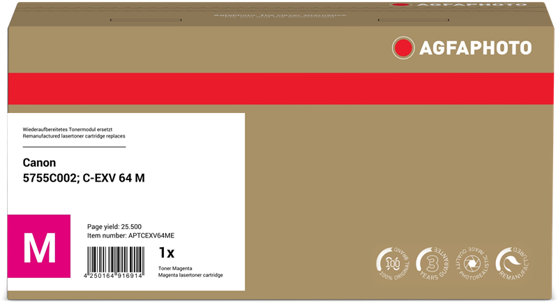 compatible with Canon C-EXV64m Agfa Photo APTCEXV64ME magenta toner (APTCEXV64ME) toner magenta ~25,500 pages kr972.56VAT incl., free shipping directly from stock Delivery time 1-2 days add to basket APTCEXV64CE cyan ~25,500 pages3.8 p / page kr972.56 APTCEXV64ME magenta ~25,500 pages3.8 p / page kr972.56 Product information "Agfa Photo APTCEXV64ME magenta toner"toner magenta ~25,500 pages Read moreread lessSuitable for the following printersCanon imageRUNNER (iR)imageRUNNER ADVANCE DX C3922iimageRUNNER ADVANCE DX C3926iimageRUNNER ADVANCE DX C3930iimageRUNNER ADVANCE DX C3935iManufacturer information on product safety (GPSR)Lupus Imaging & Media GmbH & Co. KGPilatuspool 220355 Hamburg E-mail: info@lupus-imaging-media.com Website: https://www.agfaphoto.com/ Suitable accessories for your printer Original Canon C-EXV64bk black toner (5753C002)colourTape Width Size colour: Page number:~38,000 pagesPage price:2.0 p / pagekr773.51VAT incl., free shipping directly from stock add to basket directly from stock add to basket directly from stock add to basket directly from stock add to basket Original Canon toner for your printer. Canon C-EXV64bk black toner (5753C002)colourTape Width Size:Standard colour: Page number:~38,000 pagesPage price:2.0 p / pagekr773.51VAT incl., free shipping directly from stock add to basket Canon C-EXV64c cyan toner (5754C002)colourTape Width Size:Standard colour: Page number:~25,500 pagesPage price:5.4 p / pagekr1,389.27VAT incl., free shipping directly from stock add to basket Canon C-EXV64m magenta toner (5755C002)colourTape Width Size:Standard colour: Page number:~25,500 pagesPage price:5.4 p / pagekr1,389.27VAT incl., free shipping directly from stock add to basket Canon C-EXV64y yellow toner (5756C002)colourTape Width Size:Standard colour: Page number:~25,500 pagesPage price:5.4 p / pagekr1,389.27VAT incl., free shipping directly from stock add to basket Your product is right in your shopping cart! Select your printer to make sure the selected product fits for you.Loading...