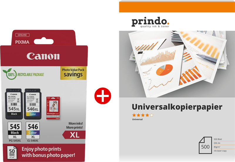 Canon PG-545XL + CL-546XL MCVP black / more colours / White value pack (+ Prindo Universal Papier 500 Blatt) (PG-545XL + CL-546XL MCVP) value pack black / more colours / White ~700 pages kr566.32VAT incl., free shipping directly from stock Delivery time 1-2 days add to basket Content PG-545XL + CL-546XL black / more colours ~700 pages 80.9 p / page Product information "Canon PG-545XL + CL-546XL MCVP black / more colours / White value pack + Prindo Universal Papier 500 Blatt"value pack black / more colours / White ~700 pages Read moreread lessSuitable for the following printersCanon PIXMA iPPIXMA iP2850Canon PIXMA MGPIXMA MG2450PIXMA MG2550PIXMA MG2550SPIXMA MG2551SPIXMA MG2555SPIXMA MG2556SPIXMA MG2950PIXMA MG3050PIXMA MG3051PIXMA MG3052PIXMA MG3053Canon PIXMA MXPIXMA MX495Canon PIXMA TRPIXMA TR4550PIXMA TR4551PIXMA TR4650PIXMA TR4651Canon PIXMA TSPIXMA TS205PIXMA TS305PIXMA TS3150PIXMA TS3151PIXMA TS3350PIXMA TS3351PIXMA TS3352PIXMA TS3355PIXMA TS3450PIXMA TS3451PIXMA TS3452Manufacturer information on product safety (GPSR)Canon Europa N.V.Bovenkerkerweg 591185 XB Amstelveen Website: www.canon-europe.com Suitable accessories for your printer Original Canon PG-545 black ink cartridge (8287B001)colourTape Width Size colour: Page number:~180 pagesPage price:107.9 p / pagekr194.16VAT incl., free shipping directly from stock add to basket directly from stock add to basket directly from stock add to basket directly from stock add to basket directly from stock add to basket directly from stock add to basket directly from stock add to basket directly from stock add to basket directly from stock add to basket directly from stock add to basket directly from stock add to basket Top seller compatible with Canon PG-545XL black (8286B001) Prindo Green XL black ink cartridgecolourTape Width Size colour: Page number:~400 pagesPage price:44.8 p / pagekr179.16VAT incl., free shipping directly from stock add to basket directly from stock add to basket directly from stock add to basket directly from stock add to basket Best price compatible with Canon PG-545XL black (8286B001) Prindo Basic XL black ink cartridgecolourTape Width Size colour: Page number:~400 pagesPage price:38.7 p / pagekr154.96VAT incl., free shipping directly from stock add to basket directly from stock add to basket directly from stock add to basket directly from stock add to basket directly from stock add to basket directly from stock add to basket directly from stock add to basket Original Canon Ink cartridge for your printer. Canon PG-545 black ink cartridge (8287B001)colourTape Width Size:Standard colour: Page number:~180 pagesPage price:107.9 p / pagekr194.16VAT incl., free shipping directly from stock add to basket Canon PG-545XL black ink cartridge (8286B001)colourTape Width Size:XL colour: Page number:~400 pagesPage price:67.9 p / pagekr271.53VAT incl., free shipping directly from stock add to basket Canon PG-545XL + CL-546XL black / more colours value pack (+ 10x15 cm Fotopapier 50 Blatt)colourTape Width Size:XL colour: Page number:~700 pagesPage price:80.9 p / pagekr566.32VAT incl., free shipping directly from stock add to basket Canon PG-545 + CL-546 black / more colours / White value pack (+ 10x15 cm Fotopapier 50 Blatt)colourTape Width Size:Standard colour: Page number:~360 pagesPage price:126.4 p / pagekr587.26-23%kr454.99VAT incl., free shipping directly from stock add to basket Canon PG-545XL+CL-546XL black / more colours / White value pack (+ 10x15 cm Fotopapier 50 Blatt)colourTape Width Size:XL colour: Page number:~700 pagesPage price:113.7 p / pagekr795.62VAT incl., free shipping directly from stock add to basket Canon PG-545XL+CL-546XL MCVP black / more colours / White value pack (+ Prindo Universal Papier 500 Blatt)colourTape Width Size:XL colour: Page number:~700 pagesPage price:114.6 p / pagekr802.01VAT incl., free shipping directly from stock add to basket Canon PG-545+CL-546 MCVP black / more colours / White / White value pack (+ Prindo Universal Papier 500 Blatt)colourTape Width Size:Standard colour: Page number:~360 pagesPage price:126.4 p / pagekr454.99VAT incl., free shipping directly from stock add to basket Canon CL-546 more colours ink cartridge (8289B001)colourTape Width Size:Standard colour: Page number:~180 pagesPage price:131.6 p / pagekr236.86VAT incl., free shipping directly from stock add to basket Canon CL-546XL more colours ink cartridge (8288B001)colourTape Width Size:XL colour: Page number:~300 pagesPage price:91.9 p / pagekr275.71VAT incl., free shipping directly from stock add to basket Canon PG-545+CL-546 multipack black / more colours (8287B005)colourTape Width Size:Standard colour: Page number:~360 pagesPage price:157.9 p / pagekr568.30VAT incl., free shipping directly from stock add to basket Canon PG-545XL+CL-546XL multipack black / more colours (8286B013)colourTape Width Size:XL colour: Page number:~1,100 pagesPage price:72.9 p / pagekr802.01VAT incl., free shipping directly from stock add to basket Our Top Sellers Compatible Prindo Green Ink cartridge for your printer.✅ Level indicator ✅ Environmentally friendly recycled ✅ More printing performance ✅ 5-year warranty ✅ No loss of warranty for your printer compatible with Canon PG-545XL black (8286B001) Prindo Green XL black ink cartridgecolourTape Width Size:XL colour: Page number:~400 pagesPage price:44.8 p / pagekr179.16VAT incl., free shipping directly from stock add to basket Prindo Green XL black / more colours value packcolourTape Width Size:XL colour: Page number:~700 pagesPage price:65.4 p / pagekr457.78VAT incl., free shipping directly from stock add to basket compatible with Canon CL-546XL more colours (8288B001) Prindo Green XL more colours ink cartridgecolourTape Width Size:XL colour: Page number:~300 pagesPage price:60.7 p / pagekr182.18VAT incl., free shipping directly from stock add to basket compatible with Canon PG-545XL+CL-546XL Prindo Green XL multipack black / more colourscolourTape Width Size:XL colour: Page