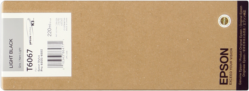 Epson T6067 lightblack ink cartridge (C13T606700) (C13T606700) ink cartridge lightblack 220ml kr1,403.02VAT incl., free shipping directly from stock Delivery time 1-2 days add to basket T6061 Black (photo) 220ml kr1,418.38 T6067 lightblack 220ml kr1,403.02 T6069 lightlightblack 220ml kr1,418.38 T6062 cyan 220ml kr1,418.38 T6065 cyan (light) 220ml kr1,387.54 T606B magenta 220ml kr1,413.96 T606C magenta (light) 220ml kr1,413.96 T6064 yellow 220ml kr1,403.02 Product information "Epson T6067 lightblack ink cartridge C13T606700"Epson's ink has been specifically designed to work with your Epson printer. For the best printing results, make sure you use only genuine Epson printer inks. When you depend on quality printed material you can rely on original Epson ink supplies to give you great results every time. Whatever Epson printer you have, you’ll find the right ink supplies you need for it here. Read moreread lessSuitable for the following printersEpson Stylus ProStylus Pro 4800Stylus Pro 4880technical dataLogistics dataProducts per pallet layer (UK)168 pc(s)Products per pallet layer120 pc(s)Products per pallet (UK)1680 pc(s)Pallet height (UK)1980 mmPallet length (UK)1200 mmPallet width (UK)1000 mmQuantity per master carton24 pc(s)Master (outer) case height198 mmMaster (outer) case length452 mmMaster (outer) case width302 mmPallet height1980 mmPallet length1200 mmPallet width800 mmPackaging contentQuantity per pack1 pc(s)Technical detailsCountry of originChinaFeaturesColourNoPrint technologyInkjetPrinting colours Black, Grey, Light blackQuantity1Compatible productsStylus Pro 4800, 4880Capacity220 mlOEM codeC13T606700Ink typePigment-based inkOriginalYesBlack ink volume220 mlquantity of black inks1MultipackNoCompatibilityStylus Pro 4800, 4880Brand compatibilityEpsonTypeOriginalPackaging dataPackage typeProducts per pallet1200 pc(s)Package weight0.427 gPackage height110 mmPackage depth290 mmPackage width30 mmAll details without engagement. Data source: IceCatManufacturer information on product safety (GPSR)Epson Deutschland GmbHSchiessstraße 4940549 Düsseldorf E-mail: info@epson.de Website: https://www.epson.de/de_DE Your product is right in your shopping cart! Select your printer to make sure the selected product fits for you.Loading...