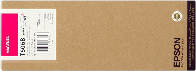 Epson T606B magenta ink cartridge (C13T606B00) (C13T606B00) ink cartridge magenta 220ml kr1,413.96VAT incl., free shipping directly from stock Delivery time 1-2 days add to basket T6061 Black (photo) 220ml kr1,418.38 T6067 lightblack 220ml kr1,403.02 T6069 lightlightblack 220ml kr1,418.38 T6062 cyan 220ml kr1,418.38 T6065 cyan (light) 220ml kr1,387.54 T606B magenta 220ml kr1,413.96 T606C magenta (light) 220ml kr1,413.96 T6064 yellow 220ml kr1,403.02 Product information "Epson T606B magenta ink cartridge C13T606B00"Epson's ink has been specifically designed to work with your Epson printer. For the best printing results, make sure you use only genuine Epson printer inks. When you depend on quality printed material you can rely on original Epson ink supplies to give you great results every time. Whatever Epson printer you have, you’ll find the right ink supplies you need for it here. Read moreread lessSuitable for the following printersEpson Stylus ProStylus Pro 4800technical dataLogistics dataProducts per pallet layer (UK)192 pc(s)Products per pallet layer144 pc(s)Products per pallet (UK)1920 pc(s)Pallet height (UK)1830 mmPallet length (UK)1200 mmPallet width (UK)1000 mmQuantity per master carton24 pc(s)Master (outer) case height183 mmMaster (outer) case length443 mmMaster (outer) case width293 mmPallet height1830 mmPallet length1200 mmPallet width800 mmPackaging contentQuantity per pack1 pc(s)Technical detailsCountry of originChinaFeaturesColourYesPrint technologyInkjetPrinting colours MagentaQuantity1Compatible productsStylus Pro 4800Capacity220 mlOEM codeC13T606B00Ink typePigment-based inkOriginalYesColour ink volume220 mlquantity of coloured inks 1MultipackNoCompatibilityStylus Pro 4800Brand compatibilityEpsonTypeOriginalPackaging dataPackage typeProducts per pallet1440 pc(s)Package weight0.43 gPackage height110 mmPackage depth290 mmPackage width30 mmAll details without engagement. Data source: IceCatManufacturer information on product safety (GPSR)Epson Deutschland GmbHSchiessstraße 4940549 Düsseldorf E-mail: info@epson.de Website: https://www.epson.de/de_DE Your product is right in your shopping cart! Select your printer to make sure the selected product fits for you.Loading...