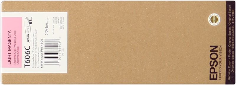 Epson T606C magenta (light) ink cartridge (C13T606C00) (C13T606C00) ink cartridge magenta (light) 220ml kr1,413.96VAT incl., free shipping directly from stock Delivery time 1-2 days add to basket T6061 Black (photo) 220ml kr1,418.38 T6067 lightblack 220ml kr1,403.02 T6069 lightlightblack 220ml kr1,418.38 T6062 cyan 220ml kr1,418.38 T6065 cyan (light) 220ml kr1,387.54 T606B magenta 220ml kr1,413.96 T606C magenta (light) 220ml kr1,413.96 T6064 yellow 220ml kr1,403.02 Product information "Epson T606C magenta (light) ink cartridge C13T606C00"Epson's ink has been specifically designed to work with your Epson printer. For the best printing results, make sure you use only genuine Epson printer inks. When you depend on quality printed material you can rely on original Epson ink supplies to give you great results every time. Whatever Epson printer you have, you’ll find the right ink supplies you need for it here. Read moreread lessSuitable for the following printersEpson Stylus ProStylus Pro 4800technical dataLogistics dataProducts per pallet layer (UK)192 pc(s)Products per pallet layer144 pc(s)Products per pallet (UK)1920 pc(s)Pallet height (UK)1830 mmPallet length (UK)1200 mmPallet width (UK)1000 mmQuantity per master carton24 pc(s)Master (outer) case height183 mmMaster (outer) case length443 mmMaster (outer) case width293 mmPallet height1830 mmPallet length1200 mmPallet width800 mmPackaging contentQuantity per pack1 pc(s)Technical detailsCountry of originChinaFeaturesColourYesPrint technologyInkjetPrinting colours Light magentaQuantity1Compatible productsStylus Pro 4800Capacity220 mlOEM codeC13T606C00Ink typePigment-based inkOriginalYesColour ink volume220 mlquantity of coloured inks 1MultipackNoCompatibilityStylus Pro 4800Brand compatibilityEpsonTypeOriginalPackaging dataPackage typeProducts per pallet1440 pc(s)Package weight0.43 gPackage height110 mmPackage depth290 mmPackage width30 mmAll details without engagement. Data source: IceCatManufacturer information on product safety (GPSR)Epson Deutschland GmbHSchiessstraße 4940549 Düsseldorf E-mail: info@epson.de Website: https://www.epson.de/de_DE Your product is right in your shopping cart! Select your printer to make sure the selected product fits for you.Loading...