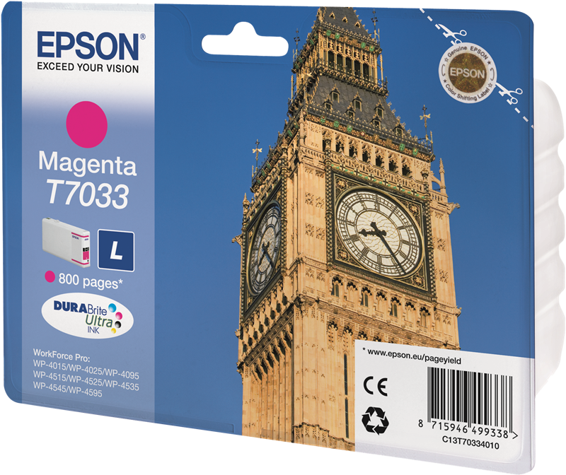 Epson T7033 magenta ink cartridge (C13T70334010) (C13T70334010) ink cartridge magenta ~800 pages kr298.28VAT incl., free shipping Delivery date unknown add to basket T7033 magenta ~800 pages37.3 p / page kr298.28 Product information "Epson T7033 magenta ink cartridge C13T70334010"Epson WorkForce Pro WP-4015 DN, Epson WorkForce Pro WP-4025 DW, Epson WorkForce Pro WP-4515 DN, Epson WorkForce Pro WP-4525 DNF, Epson WorkForce Pro WP-4535 DWF, Epson WorkForce Pro WP-4545 DTWF Read moreread lessSuitable for the following printersEpson WorkForce ProWorkForce Pro WP-4015DNWorkForce Pro WP-4025DWWorkForce Pro WP-4095DNWorkForce Pro WP-4515DNWorkForce Pro WP-4525DNFWorkForce Pro WP-4535DWFWorkForce Pro WP-4545DTWFWorkForce Pro WP-4595DNFtechnical dataLogistics dataProducts per pallet layer (UK)120 pc(s)Products per pallet layer120 pc(s)Products per pallet (UK)1080 pc(s)Pallet height (UK)480 mmPallet length (UK)1200 mmPallet width (UK)1000 mmPallet height480 mmPallet length1200 mmPallet width800 mmPackaging contentQuantity per pack1 pc(s)Technical detailsCountry of originChinaFeaturesColourYesPrint technologyInkjet printingPrinting colours MagentaQuantity1Compatible productsEpson WorkForce Pro WP-4015 DN, Epson WorkForce Pro WP-4025 DW, Epson WorkForce Pro WP-4515 DN, Epson WorkForce Pro WP-4525 DNF, Epson WorkForce Pro WP-4535 DWF, Epson WorkForce Pro WP-4545 DTWFPage yield800 pagesMinimum order quantity10 pc(s)OEM codeC13T70334010Ink typePigment-based inkOriginalYesquantity of coloured inks 1MultipackNoCompatibilityWorkForce Pro WP-4015 DN, WorkForce Pro WP-4025 DW, WorkForce Pro WP-4515 DN, WorkForce Pro WP-4525 DNF, WorkForce Pro WP-4535 DWF, WorkForce Pro WP-4545 DTWFBrand compatibilityEpsonTypeOriginalPackaging dataPackage typeProducts per pallet1080 pc(s)Package weight0.112 gPackage height195 mmPackage depth37 mmPackage width150 mmAll details without engagement. Data source: IceCatManufacturer information on product safety (GPSR)Epson Deutschland GmbHSchiessstraße 4940549 Düsseldorf E-mail: info@epson.de Website: https://www.epson.de/de_DE Suitable accessories for your printer Original Epson T7011 XXL black ink cartridge (C13T70114010)colourTape Width Size colour: Page number:~3,400 pagesPage price:21.8 p / pagekr739.77VAT incl., free shipping directly from stock add to basket Delivery date unknown add to basket directly from stock add to basket directly from stock add to basket Price / performance winner Prindo Classic XL black ink cartridgecolourTape Width Size colour: Page number:~2,400 pagesPage price:10.5 p / pagekr252.56VAT incl., free shipping directly from stock add to basket directly from stock add to basket directly from stock add to basket directly from stock add to basket Original Epson Ink cartridge for your printer. Epson T7011 XXL black ink cartridge (C13T70114010)colourTape Width Size:XXL colour: Page number:~3,400 pagesPage price:21.8 p / pagekr739.77VAT incl., free shipping directly from stock add to basket Epson T7012 XXL cyan ink cartridge (C13T70124010)colourTape Width Size:XXL colour: Page number:~3,400 pagesPage price:24.6 p / pagekr835.40VAT incl., free shipping Delivery date unknown add to basket Epson T7013 XXL magenta ink cartridge (C13T70134010)colourTape Width Size:XXL colour: Page number:~3,400 pagesPage price:24.9 p / pagekr847.62VAT incl., free shipping directly from stock add to basket Epson T7014 XXL yellow ink cartridge (C13T70144010)colourTape Width Size:XXL colour: Page number:~3,400 pagesPage price:24.9 p / pagekr847.62VAT incl., free shipping directly from stock add to basket Our price / performance winners Compatible Prindo Classic Ink cartridge for your printer.✅ Level indicator ✅ More printing performance ✅ 5-year warranty ✅ No loss of warranty for your printer Prindo Classic XL black ink cartridgecolourTape Width Size:XL colour: Page number:~2,400 pagesPage price:10.5 p / pagekr252.56VAT incl., free shipping directly from stock add to basket Prindo Classic XL cyan ink cartridgecolourTape Width Size:XL colour: Page number:~2,000 pagesPage price:12.6 p / pagekr252.56VAT incl., free shipping directly from stock add to basket Prindo Classic XL magenta ink cartridgecolourTape Width Size:XL colour: Page number:~2,000 pagesPage price:12.6 p / pagekr252.56VAT incl., free shipping directly from stock add to basket Prindo Classic XL yellow ink cartridgecolourTape Width Size:XL colour: Page number:~2,000 pagesPage price:12.6 p / pagekr252.56VAT incl., free shipping directly from stock add to basket Your product is right in your shopping cart! Select your printer to make sure the selected product fits for you.Loading...