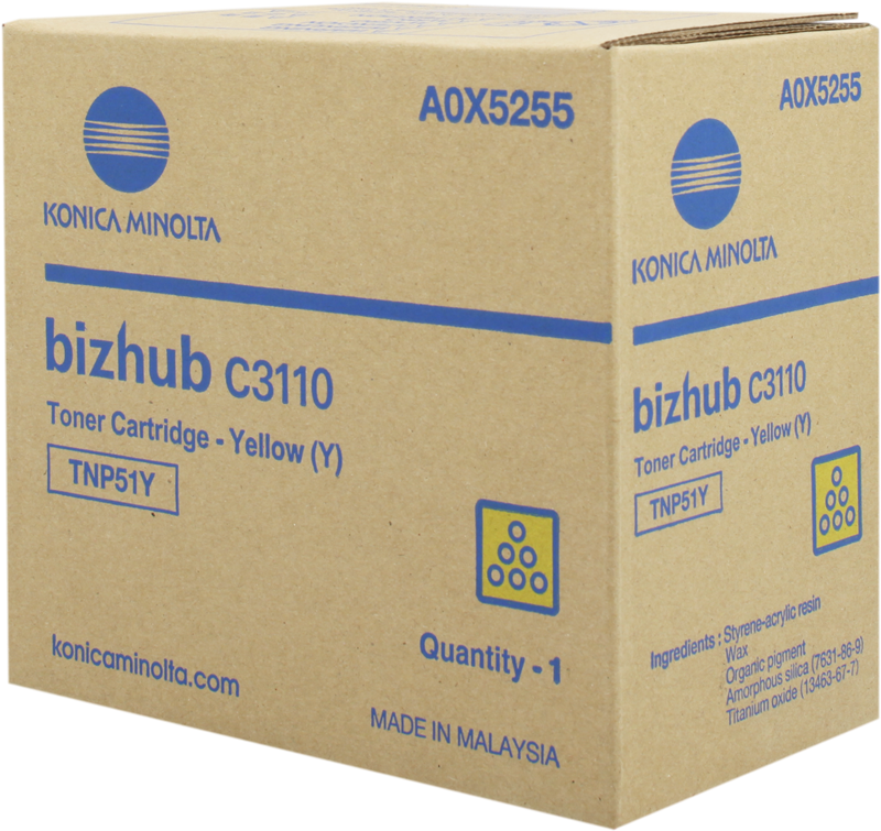 Konica Minolta TNP51Y yellow toner (A0X5255) (A0X5255) toner yellow ~6,000 pages kr773.51VAT incl., free shipping Delivery date unknown add to basket TNP51K black ~6,000 pages4.1 p / page kr244.65 TNP51Y yellow ~6,000 pages12.9 p / page kr773.51 Product information "Konica Minolta TNP51Y yellow toner"toner yellow ~6,000 pages Read moreread lessSuitable for the following printersKonica Minolta bizhubbizhub C3110technical dataTechnical detailsCompatibilityBizhub C3110FeaturesPrinting colours YellowPage yield5000 pagesPrint technologyLaserCompatible productsBizhub C3110TypeOriginalQuantity1Colour toner page yield5000 pagesQuantity per pack1 pc(s)Brand compatibilityKonica MinoltaOriginalYesAll details without engagement. Data source: IceCatManufacturer information on product safety (GPSR)Konica Minolta Business Solutions Europe GmbHEuropaallee 1730855 Langenhagen E-mail: https://www.konicaminolta.eu/eu-en/contact Website: https://www.konicaminolta.eu/ Your product is right in your shopping cart! Select your printer to make sure the selected product fits for you.Loading...
