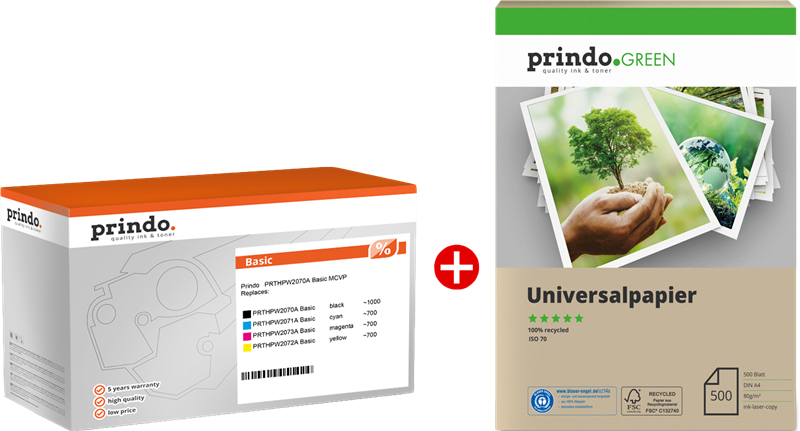 Prindo Basic black / cyan / magenta / yellow value pack (PRTHPW2070A MCVP) value pack black / cyan / magenta / yellow kr1,468.85-21%kr1,160.33VAT incl., free shipping directly from stock Delivery time 1-2 days add to basket Content Basic black ~1.000 pages 26.5 p / page Basic cyan ~700 pages 41.5 p / page Basic magenta ~700 pages 38.2 p / page Basic yellow ~700 pages 41.5 p / page Graduated pricesfrom 1 pcs.kr1,160.33VAT incl.from 2 pcs.kr1,102.32VAT incl.from 4 pcs.kr1,044.30VAT incl.from 6 pcs.kr986.29VAT incl. Product information "Prindo Basic black / cyan / magenta / yellow value pack PRTHPW2070A MCVP"value pack black / cyan / magenta / yellow Prindo Promise: Top quality for a fair price, that is what our exclusive private label product line stand for Remanufactured original toners and cartridges, working parts changes and only highest quality of colors and materials Only selected partners and suppliers 5 years guarantee on Prindo products – no loss of warranty for your printer Read moreread lessSuitable for the following printersHP Color LaserColor Laser 150aColor Laser 150nwColor Laser MFP 178nwgColor Laser MFP 179fwgtechnical dataWeight & dimensionsWeight5230 kgHeight400 mmDepth370 mmWidth285 mmFeaturesBrand compatibilityPrindoCartridge return & recyclingYesMaster (outer) case GTIN (EAN/UPC)SizeStandardYesAll details without engagement. Data source: IceCatManufacturer information on product safety (GPSR)Media-Concept Bürobedarf GmbH Inselkammerstrasse 582008 Unterhaching E-mail: mail@prindo.no Website: www.prindo.no Suitable accessories for your printer Original HP 117A black toner (W2070A)colourTape Width Size colour: Page number:~1,000 pagesPage price:59.4 p / pagekr593.66VAT incl., free shipping directly from stock add to basket directly from stock add to basket directly from stock add to basket directly from stock add to basket directly from stock add to basket Top seller compatible with HP 117A Prindo Green black tonercolourTape Width Size colour: Page number:~1,000 pagesPage price:39.2 p / pagekr391.58VAT incl., free shipping directly from stock add to basket directly from stock add to basket directly from stock add to basket directly from stock add to basket directly from stock add to basket Price / performance winner compatible with HP 117A Prindo Classic black tonercolourTape Width Size colour: Page number:~1,000 pagesPage price:36.4 p / pagekr363.55VAT incl., free shipping directly from stock add to basket directly from stock add to basket directly from stock add to basket directly from stock add to basket directly from stock add to basket directly from stock add to basket Best price compatible with HP 117A Prindo Basic black tonercolourTape Width Size colour: Page number:~1,000 pagesPage price:33.6 p / pagekr335.63VAT incl., free shipping directly from stock add to basket directly from stock add to basket directly from stock add to basket directly from stock add to basket Original HP toner for your printer. HP 117A black toner (W2070A)colourTape Width Size:Standard colour: Page number:~1,000 pagesPage price:59.4 p / pagekr593.66VAT incl., free shipping directly from stock add to basket HP + Prindo Universal Papier 2500 Blatt black / cyan / magenta / yellow / White value pack (117A MCVP 02)colourTape Width Size:Standard colour: Page number:~3,100 pagesPage price:89.8 p / pagekr2,784.01VAT incl., free shipping directly from stock add to basket HP 117A cyan toner (W2071A)colourTape Width Size:Standard colour: Page number:~700 pagesPage price:93.1 p / pagekr651.48VAT incl., free shipping directly from stock add to basket HP 117A magenta toner (W2073A)colourTape Width Size:Standard colour: Page number:~700 pagesPage price:93.1 p / pagekr651.48VAT incl., free shipping directly from stock add to basket HP 117A yellow toner (W2072A)colourTape Width Size:Standard colour: Page number:~700 pagesPage price:93.1 p / pagekr651.48VAT incl., free shipping directly from stock add to basket Our Top Sellers Compatible Prindo Green toner for your printer.✅ Level indicator ✅ Environmentally friendly recycled ✅ More printing performance ✅ 5-year warranty ✅ No loss of warranty for your printer compatible with HP 117A Prindo Green black tonercolourTape Width Size:Standard colour: Page number:~1,000 pagesPage price:39.2 p / pagekr391.58VAT incl., free shipping directly from stock add to basket Prindo Green black / cyan / magenta / yellow value packcolourTape Width Size:Standard colour: Page number:~3,100 pagesPage price:51.3 p / pagekr1,939.41-18%kr1,590.18VAT incl., free shipping directly from stock add to basket compatible with HP 117A Prindo Green cyan tonercolourTape Width Size:Standard colour: Page number:~700 pagesPage price:61.3 p / pagekr429.16VAT incl., free shipping directly from stock add to basket compatible with HP 117A Prindo Green magenta tonercolourTape Width Size:Standard colour: Page number:~700 pagesPage price:56.4 p / pagekr395.07VAT incl., free shipping directly from stock add to basket compatible with HP 117A Prindo Green yellow tonercolourTape Width Size:Standard colour: Page number:~700 pagesPage price:61.3 p / pagekr429.16VAT incl., free shipping directly from stock add to basket Our price / performance winners Compatible Prindo Classic toner for your printer.✅ Level indicator ✅ More printing performance ✅ 5-year warranty ✅ No loss of warranty for your printer compatible with HP 117A Prindo Classic black tonercolourTape Width Size:Standard colour: Page number:~1,000 pagesPage price:36.4 p / pagekr363.55VAT incl., free shipping directly from stock add to basket Prindo Classic black / cyan / magenta / yellow value packcolourTape Width Size:Standard colour: Page number:~3,100 pagesPage price:39.7 p / pagekr1,834.15-33%kr1,229.43VAT incl., free shipping directly from stock add to basket Prindo Classic black / cyan / magenta / yellow value packcolourTape Width Size:Standard colour: Page number:~3,100 pagesPage price:39.7 p / pagekr1,527.14-19%kr1,229.43V