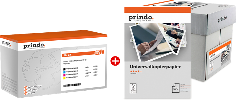 Prindo Basic black / cyan / magenta / yellow / White value pack (PRTKYTK5430 MCVP 01) value pack black / cyan / magenta / yellow / White ~5,000 pages kr2,097.53-15%kr1,790.63VAT incl., free shipping directly from stock Delivery time 1-2 days add to basket Content Basic black ~1.250 pages 24.6 p / page Basic cyan ~1.250 pages 32.6 p / page Basic magenta ~1.250 pages 32.6 p / page Basic yellow ~1.250 pages 32.6 p / page White Graduated pricesfrom 1 pcs.kr1,790.63VAT incl.from 2 pcs.kr1,701.15VAT incl.from 4 pcs.kr1,611.62VAT incl.from 6 pcs.kr1,522.08VAT incl. Product information "Prindo Basic black / cyan / magenta / yellow / White value pack PRTKYTK5430 MCVP 01"value pack black / cyan / magenta / yellow / White ~5,000 pages Prindo Promise: Top quality for a fair price, that is what our exclusive private label product line stand for Remanufactured original toners and cartridges, working parts changes and only highest quality of colors and materials Only selected partners and suppliers 5 years guarantee on Prindo products – no loss of warranty for your printer Read moreread lessSuitable for the following printersKyocera ECOSYS MAECOSYS MA2100cfxECOSYS MA2100cwfxKyocera ECOSYS PAECOSYS PA2100cwxECOSYS PA2100cxManufacturer information on product safety (GPSR)Media-Concept Bürobedarf GmbH Inselkammerstrasse 582008 Unterhaching E-mail: mail@prindo.no Website: www.prindo.no Suitable accessories for your printer Original Kyocera TK-5430K black toner (1T0C0A0NL1)colourTape Width Size colour: Page number:~1,250 pagesPage price:49.3 p / pagekr616.46VAT incl., free shipping directly from stock add to basket directly from stock add to basket directly from stock add to basket directly from stock add to basket directly from stock add to basket directly from stock add to basket directly from stock add to basket directly from stock add to basket directly from stock add to basket Price / performance winner compatible with Kyocera TK-5440K Prindo Classic black tonercolourTape Width Size colour: Page number:~2,800 pagesPage price:18.8 p / pagekr525.02VAT incl., free shipping directly from stock add to basket directly from stock add to basket directly from stock add to basket directly from stock add to basket directly from stock add to basket Best price compatible with Kyocera TK-5430K Prindo Basic black tonercolourTape Width Size colour: Page number:~1,250 pagesPage price:28.8 p / pagekr359.94VAT incl., free shipping directly from stock add to basket directly from stock add to basket directly from stock add to basket directly from stock add to basket Original Kyocera toner for your printer. Kyocera TK-5430K black toner (1T0C0A0NL1)colourTape Width Size:Standard colour: Page number:~1,250 pagesPage price:49.3 p / pagekr616.46VAT incl., free shipping directly from stock add to basket Kyocera TK-5440K black toner (1T0C0A0NL0)colourTape Width Size:Standard colour: Page number:~2,800 pagesPage price:29.2 p / pagekr816.79VAT incl., free shipping directly from stock add to basket Kyocera TK-5440 MCVP black / cyan / magenta / yellow / White value pack (+ Prindo Universal Papier 2500 Blatt)colourTape Width Size:Standard colour: Page number:~10,000 pagesPage price:46.6 p / pagekr4,656.42VAT incl., free shipping directly from stock add to basket Kyocera TK-5430C cyan toner (1T0C0ACNL1)colourTape Width Size:Standard colour: Page number:~1,250 pagesPage price:65.3 p / pagekr816.79VAT incl., free shipping directly from stock add to basket Kyocera TK-5440C cyan toner (1T0C0ACNL0)colourTape Width Size:Standard colour: Page number:~2,400 pagesPage price:50.1 p / pagekr1,202.09VAT incl., free shipping directly from stock add to basket Kyocera TK-5430M magenta toner (1T0C0ABNL1)colourTape Width Size:Standard colour: Page number:~1,250 pagesPage price:64.1 p / pagekr801.32VAT incl., free shipping directly from stock add to basket Kyocera TK-5440M magenta toner (1T0C0ABNL0)colourTape Width Size:Standard colour: Page number:~2,400 pagesPage price:50.1 p / pagekr1,202.09VAT incl., free shipping directly from stock add to basket Kyocera TK-5430Y yellow toner (1T0C0AANL1)colourTape Width Size:Standard colour: Page number:~1,250 pagesPage price:65.3 p / pagekr816.79VAT incl., free shipping directly from stock add to basket Kyocera TK-5440Y yellow toner (1T0C0AANL0)colourTape Width Size:Standard colour: Page number:~2,400 pagesPage price:50.1 p / pagekr1,202.09VAT incl., free shipping directly from stock add to basket Our price / performance winners Compatible Prindo Classic toner for your printer.✅ Level indicator ✅ More printing performance ✅ 5-year warranty ✅ No loss of warranty for your printer compatible with Kyocera TK-5440K Prindo Classic black tonercolourTape Width Size:Standard colour: Page number:~2,800 pagesPage price:18.8 p / pagekr525.02VAT incl., free shipping directly from stock add to basket Prindo Classic black / cyan / magenta / yellow / White value packcolourTape Width Size:Standard colour: Page number:~10,000 pagesPage price:28.6 p / pagekr3,171.40-10%kr2,864.52VAT incl., free shipping directly from stock add to basket compatible with Kyocera TK-5440C Prindo Classic cyan tonercolourTape Width Size:Standard colour: Page number:~2,400 pagesPage price:32.5 p / pagekr779.79VAT incl., free shipping directly from stock add to basket compatible with Kyocera TK-5440M Prindo Classic magenta tonercolourTape Width Size:Standard colour: Page number:~2,400 pagesPage price:32.5 p / pagekr779.79VAT incl., free shipping directly from stock add to basket compatible with Kyocera TK-5440Y Prindo Classic yellow tonercolourTape Width Size:Standard colour: Page number:~2,400 pagesPage price:32.5 p / pagekr779.79VAT incl., free shipping directly from stock add to basket Our cheap alternatives Compatible Prindo Basic toner for your printer.✅ More printing performance ✅ 5-year warranty ✅ No loss of warranty for your printer compatible with Kyocera TK-5430K Prindo Basic black tonercolourTape Width Size:Standard colour: Pag