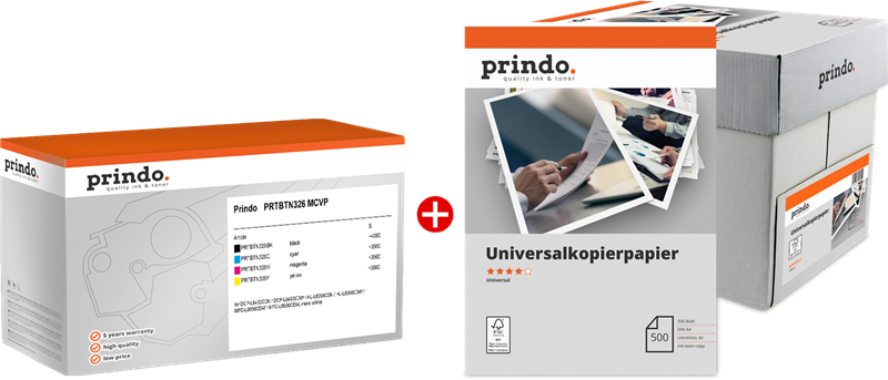 Prindo Classic black / cyan / magenta / yellow value pack (PRTBTN326 MCVP) 4 toner: 1x PRTBTN326BK + 1x PRTBTN326C + 1x PRTBTN326M + 1x PRTBTN326Y + 1x Prindo paper (PR802500A4P) 5x 500 sheets (1 box), DIN A4 white 80g/m² CI kr2,058.78VAT incl., free shipping directly from stock Delivery time 1-2 days add to basket Content White Classic black / cyan / magenta / yellow Graduated pricesfrom 1 pcs.kr2,058.78VAT incl.from 2 pcs.kr1,955.87VAT incl.from 4 pcs.kr1,852.93VAT incl.from 6 pcs.kr1,749.99VAT incl. Product information "Prindo Classic black / cyan / magenta / yellow value pack PRTBTN326 MCVP"value pack black / cyan / magenta / yellow Prindo Promise: Top quality for a fair price, that is what our exclusive private label product line stand for Remanufactured original toners and cartridges, working parts changes and only highest quality of colors and materials Only selected partners and suppliers 5 years guarantee on Prindo products – no loss of warranty for your printer Read moreread lessSuitable for the following printersBrother DCP-LDCP-L8400CDNDCP-L8450CDWBrother HL-LHL-L8250CDNHL-L8350CDWBrother MFCMFC-L8650CDWMFC-L8850CDWtechnical dataWeight & dimensionsWeight16965 kgHeight430 mmDepth600 mmWidth410 mmFeaturesBrand compatibilityPrindoCartridge return & recyclingYesMaster (outer) case GTIN (EAN/UPC)SizeStandardYesAll details without engagement. Data source: IceCatManufacturer information on product safety (GPSR)Media-Concept Bürobedarf GmbH Inselkammerstrasse 582008 Unterhaching E-mail: mail@prindo.no Website: www.prindo.no Suitable accessories for your printer Original Brother TN-321BK black tonercolourTape Width Size colour: Page number:~2,500 pagesPage price:31.6 p / pagekr790.50VAT incl., free shipping directly from stock add to basket directly from stock add to basket directly from stock add to basket directly from stock add to basket directly from stock add to basket directly from stock add to basket directly from stock add to basket directly from stock add to basket Top seller compatible with Brother TN-326BK Prindo Green black tonercolourTape Width Size colour: Page number:~4,000 pagesPage price:11.7 p / pagekr467.32VAT incl., free shipping directly from stock add to basket Price / performance winner compatible with Brother TN-326BK Prindo Classic black tonercolourTape Width Size colour: Page number:~4,000 pagesPage price:13.7 p / pagekr546.89VAT incl., free shipping directly from stock add to basket directly from stock add to basket directly from stock add to basket directly from stock add to basket directly from stock add to basket directly from stock add to basket Original Brother toner for your printer. Brother TN-321BK black tonercolourTape Width Size:Standard colour: Page number:~2,500 pagesPage price:31.6 p / pagekr790.50VAT incl., free shipping directly from stock add to basket Brother TN-326BK black tonercolourTape Width Size:Standard colour: Page number:~4,000 pagesPage price:22.3 p / pagekr892.75VAT incl., free shipping directly from stock add to basket Brother TN-321C cyan tonercolourTape Width Size:Standard colour: Page number:~1,500 pagesPage price:70.2 p / pagekr1,052.95VAT incl., free shipping directly from stock add to basket Brother TN-326C cyan tonercolourTape Width Size:Standard colour: Page number:~3,500 pagesPage price:49.9 p / pagekr1,747.12VAT incl., free shipping directly from stock add to basket Brother TN-321M magenta tonercolourTape Width Size:Standard colour: Page number:~1,500 pagesPage price:70.2 p / pagekr1,052.25VAT incl., free shipping directly from stock add to basket Brother TN-326M magenta tonercolourTape Width Size:Standard colour: Page number:~3,500 pagesPage price:50.0 p / pagekr1,749.79VAT incl., free shipping directly from stock add to basket Brother TN-321Y yellow tonercolourTape Width Size:Standard colour: Page number:~1,500 pagesPage price:68.6 p / pagekr1,028.52VAT incl., free shipping directly from stock add to basket Brother TN-326Y yellow tonercolourTape Width Size:Standard colour: Page number:~3,500 pagesPage price:50.0 p / pagekr1,749.79VAT incl., free shipping directly from stock add to basket Our Top Sellers Compatible Prindo Green toner for your printer.✅ Level indicator ✅ Environmentally friendly recycled ✅ More printing performance ✅ 5-year warranty ✅ No loss of warranty for your printer compatible with Brother TN-326BK Prindo Green black tonercolourTape Width Size:Standard colour: Page number:~4,000 pagesPage price:11.7 p / pagekr467.32VAT incl., free shipping directly from stock add to basket Our price / performance winners Compatible Prindo Classic value pack for your printer.✅ Level indicator ✅ More printing performance ✅ 5-year warranty ✅ No loss of warranty for your printer compatible with Brother TN-326BK Prindo Classic black tonercolourTape Width Size:Standard colour: Page number:~4,000 pagesPage price:13.7 p / pagekr546.89VAT incl., free shipping directly from stock add to basket Prindo Classic black / cyan / magenta / yellow value packcolourTape Width Size:Standard colour: Page number:~7,000 pagesPage price:22.6 p / pagekr1,578.67VAT incl., free shipping directly from stock add to basket Prindo Classic black / cyan / magenta / yellow value packcolourTape Width Size:Standard colour: Page number:~14,500 pagesPage price:12.6 p / pagekr3,679.43-50%kr1,831.23VAT incl., free shipping directly from stock add to basket compatible with Brother TN-326C Prindo Classic cyan tonercolourTape Width Size:Standard colour: Page number:~3,500 pagesPage price:29.6 p / pagekr1,034.68VAT incl., free shipping directly from stock add to basket compatible with Brother TN-326M Prindo Classic magenta tonercolourTape Width Size:Standard colour: Page number:~3,500 pagesPage price:29.7 p / pagekr1,040.03VAT incl., free shipping directly from stock add to basket compatible with Brother TN-326Y Prindo Classic yellow tonercolourTape Width Size:Standard colour: Page number:~3,500 pagesPage price:30.2 p / pagekr1,057.83VAT 