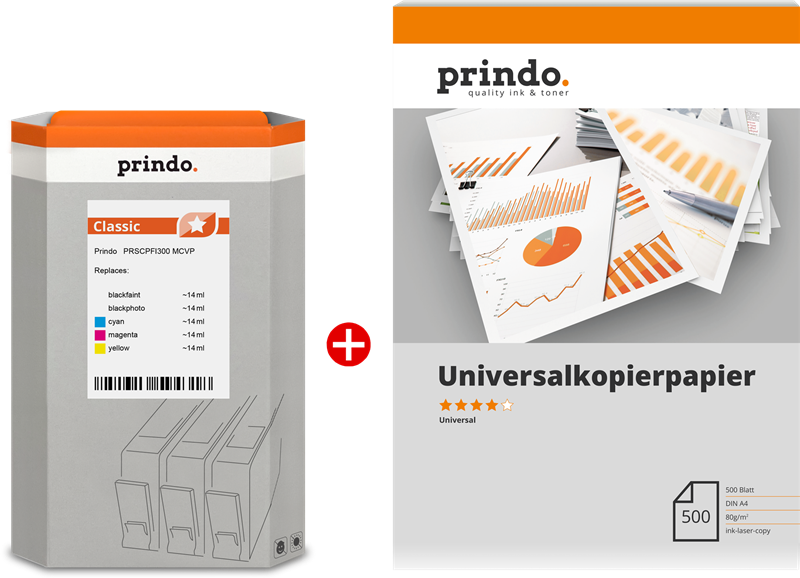 Prindo Classic Black (matt) / Black (photo) / cyan / magenta / yellow / White value pack (PRSCPFI300 MCVP) value pack Black (matt) / Black (photo) / cyan / magenta / yellow / White kr662.30VAT incl., free shipping Delivery date unknown add to basket Content Prindo Classic Black (matt) ~1.750 pages 7.1 p / page Prindo Classic Black (photo) ~303 pages 42.3 p / page Prindo Classic cyan ~735 pages 16.7 p / page Prindo Classic magenta ~785 pages 16.0 p / page Prindo Classic yellow ~530 pages 23.5 p / page White Product information "Prindo Classic Black (matt) / Black (photo) / cyan / magenta / yellow / White value pack PRSCPFI300 MCVP"value pack Black (matt) / Black (photo) / cyan / magenta / yellow / White Prindo Promise: Top quality for a fair price, that is what our exclusive private label product line stand for Remanufactured original toners and cartridges, working parts changes and only highest quality of colors and materials Only selected partners and suppliers 5 years guarantee on Prindo products – no loss of warranty for your printer Read moreread lessSuitable for the following printersCanon imagePROGRAF (iPF)iPF PRO-300Manufacturer information on product safety (GPSR)Media-Concept Bürobedarf GmbH Inselkammerstrasse 582008 Unterhaching E-mail: mail@prindo.no Website: www.prindo.no Suitable accessories for your printer Original Canon PFI-300mbk Black (matt) ink cartridge (4192C001)colourTape Width Size colour: Page number:~1,750 pagesPage price:11.6 p / pagekr202.89VAT incl., free shipping directly from stock add to basket directly from stock add to basket directly from stock add to basket directly from stock add to basket directly from stock add to basket directly from stock add to basket directly from stock add to basket directly from stock add to basket directly from stock add to basket directly from stock add to basket directly from stock add to basket Price / performance winner compatible with Canon PFI-300mbk Black (matt) (4192C001) Prindo Classic Black (matt) ink cartridgecolourTape Width Size colour: Page number:~1,750 pagesPage price:7.1 p / pagekr124.25VAT incl., free shipping directly from stock add to basket directly from stock add to basket directly from stock add to basket directly from stock add to basket directly from stock add to basket directly from stock add to basket directly from stock add to basket directly from stock add to basket directly from stock add to basket directly from stock add to basket Original Canon multipack for your printer. Canon PFI-300mbk Black (matt) ink cartridge (4192C001)colourTape Width Size:Standard colour: Page number:~1,750 pagesPage price:11.6 p / pagekr202.89VAT incl., free shipping directly from stock add to basket Canon PFI-300pbk Black (photo) ink cartridge (4193C001)colourTape Width Size:Standard colour: Page number:~303 pagesPage price:69.0 p / pagekr208.94VAT incl., free shipping directly from stock add to basket Canon PFI-300c cyan ink cartridge (4194C001)colourTape Width Size:Standard colour: Page number:~735 pagesPage price:27.3 p / pagekr200.45VAT incl., free shipping directly from stock add to basket Canon PFI-300pc cyanfoto ink cartridge (4197C001)colourTape Width Size:Standard colour: Page number:~625 pagesPage price:34.1 p / pagekr213.13VAT incl., free shipping directly from stock add to basket Canon PFI-300gy Gray ink cartridge (4200C001)colourTape Width Size:Standard colour: Page number:~236 pagesPage price:86.3 p / pagekr203.59VAT incl., free shipping directly from stock add to basket Canon PFI-300m magenta ink cartridge (4195C001)colourTape Width Size:Standard colour: Page number:~785 pagesPage price:26.1 p / pagekr205.21VAT incl., free shipping directly from stock add to basket Canon PFI-300pm magentafoto ink cartridge (4198C001)colourTape Width Size:Standard colour: Page number:~530 pagesPage price:38.7 p / pagekr205.21VAT incl., free shipping directly from stock add to basket Canon PFI-300r Red ink cartridge (4199C001)colourTape Width Size:Standard colour: Page number:~920 pagesPage price:21.8 p / pagekr200.45VAT incl., free shipping directly from stock add to basket Canon PFI-300co clear ink cartridge (4201C001)colourTape Width Size:Standard colour: Page number:~272 pagesPage price:73.7 p / pagekr200.33VAT incl., free shipping directly from stock add to basket Canon PFI-300y yellow ink cartridge (4196C001)colourTape Width Size:Standard colour: Page number:~530 pagesPage price:38.4 p / pagekr203.59VAT incl., free shipping directly from stock add to basket Canon PFI-300 10 Tintentanks multipack Black (matt) / Black (photo) / cyan / magenta / yellow / cyan / magenta / Red / Gray / clear (4192C008)colourTape Width Size:Standard colour: Page number:~6,686 pagesPage price:29.5 p / pagekr1,973.39VAT incl., free shipping directly from stock add to basket Our price / performance winners Compatible Prindo Classic Ink cartridge for your printer.✅ Level indicator ✅ More printing performance ✅ 5-year warranty ✅ No loss of warranty for your printer compatible with Canon PFI-300mbk Black (matt) (4192C001) Prindo Classic Black (matt) ink cartridgecolourTape Width Size:Standard colour: Page number:~1,750 pagesPage price:7.1 p / pagekr124.25VAT incl., free shipping directly from stock add to basket compatible with Canon PFI-300pbk Black (photo) (4193C001) Prindo Classic Black (photo) ink cartridgecolourTape Width Size:Standard colour: Page number:~303 pagesPage price:42.3 p / pagekr128.08VAT incl., free shipping directly from stock add to basket compatible with Canon PFI-300c cyan (4194C001) Prindo Classic cyan ink cartridgecolourTape Width Size:Standard colour: Page number:~735 pagesPage price:16.7 p / pagekr122.73VAT incl., free shipping directly from stock add to basket compatible with Canon PFI-300pc cyanfoto (4197C001) Prindo Classic cyanfoto ink cartridgecolourTape Width Size:Standard colour: Page number:~625 pagesPage price:20.9 p / pagekr130.53VAT incl., free shipping directly from stock add to basket compatible 
