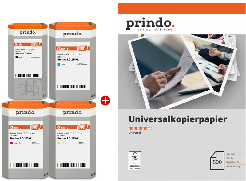 Prindo Classic XL black / cyan / magenta / yellow value pack (PRSBLC227XL_225XL MCVP) value pack black / cyan / magenta / yellow ~4,800 pages kr464.29-15%kr394.72VAT incl., free shipping directly from stock Delivery time 1-2 days add to basket Content White Prindo Classic XL cyan ~1.200 pages 9.2 p / page Prindo Classic XL magenta ~1.200 pages 9.7 p / page Prindo Classic XL yellow ~1.200 pages 9.2 p / page Graduated pricesfrom 1 pcs.kr394.72VAT incl.from 2 pcs.kr374.94VAT incl.from 4 pcs.kr355.21VAT incl.from 6 pcs.kr335.48VAT incl. Product information "Prindo Classic XL black / cyan / magenta / yellow value pack PRSBLC227XL_225XL MCVP"value pack black / cyan / magenta / yellow ~4,800 pages Prindo Promise: Top quality for a fair price, that is what our exclusive private label product line stand for Remanufactured original toners and cartridges, working parts changes and only highest quality of colors and materials Only selected partners and suppliers 5 years guarantee on Prindo products – no loss of warranty for your printer Read moreread lessSuitable for the following printersBrother DCP-JDCP-J4120DWBrother MFC-JMFC-J4420DWMFC-J4620DWMFC-J4625DWtechnical dataWeight & dimensionsWeight2860 kgHeight145 mmDepth310 mmWidth220 mmFeaturesBrand compatibilityPrindoCartridge return & recyclingYesMaster (outer) case GTIN (EAN/UPC)SizeXLYesPage yield4800 pagesAll details without engagement. Data source: IceCatManufacturer information on product safety (GPSR)Media-Concept Bürobedarf GmbH Inselkammerstrasse 582008 Unterhaching E-mail: mail@prindo.no Website: www.prindo.no Suitable accessories for your printer Original Brother LC223BK black ink cartridgecolourTape Width Size colour: Page number:~550 pagesPage price:45.5 p / pagekr250.12VAT incl., free shipping directly from stock add to basket directly from stock add to basket directly from stock add to basket directly from stock add to basket directly from stock add to basket directly from stock add to basket directly from stock add to basket directly from stock add to basket directly from stock add to basket directly from stock add to basket Top seller compatible with Brother LC223BK black Prindo Green black ink cartridgecolourTape Width Size colour: Page number:~550 pagesPage price:29.1 p / pagekr159.84VAT incl., free shipping directly from stock add to basket directly from stock add to basket directly from stock add to basket directly from stock add to basket directly from stock add to basket directly from stock add to basket directly from stock add to basket directly from stock add to basket directly from stock add to basket directly from stock add to basket Price / performance winner compatible with Brother LC223BK black Prindo Classic black ink cartridgecolourTape Width Size colour: Page number:~550 pagesPage price:27.0 p / pagekr148.56VAT incl., free shipping directly from stock add to basket directly from stock add to basket Delivery date unknown add to basket directly from stock add to basket directly from stock add to basket directly from stock add to basket directly from stock add to basket directly from stock add to basket directly from stock add to basket Original Brother Ink cartridge for your printer. Brother LC223BK black ink cartridgecolourTape Width Size:Standard colour: Page number:~550 pagesPage price:45.5 p / pagekr250.12VAT incl., free shipping directly from stock add to basket Brother LC227XLBK black ink cartridgecolourTape Width Size:XL colour: Page number:~1,200 pagesPage price:29.4 p / pagekr353.31VAT incl., free shipping directly from stock add to basket Brother LC-227XL+LC-225XL black / cyan / magenta / yellow value pack (LC227XLVALBPDR)colourTape Width Size:XL colour: Page number:~4,800 pagesPage price:20.5 p / pagekr982.57VAT incl., free shipping directly from stock add to basket Brother LC223C cyan ink cartridgecolourTape Width Size:Standard colour: Page number:~550 pagesPage price:29.6 p / pagekr162.87VAT incl., free shipping directly from stock add to basket Brother LC225XLC cyan ink cartridgecolourTape Width Size:XL colour: Page number:~1,200 pagesPage price:18.4 p / pagekr220.22VAT incl., free shipping directly from stock add to basket Brother LC223M magenta ink cartridgecolourTape Width Size:Standard colour: Page number:~550 pagesPage price:29.6 p / pagekr162.87VAT incl., free shipping directly from stock add to basket Brother LC225XLM magenta ink cartridgecolourTape Width Size:XL colour: Page number:~1,200 pagesPage price:18.6 p / pagekr222.67VAT incl., free shipping directly from stock add to basket Brother LC223Y yellow ink cartridgecolourTape Width Size:Standard colour: Page number:~550 pagesPage price:30.0 p / pagekr164.96VAT incl., free shipping directly from stock add to basket Brother LC225XLY yellow ink cartridgecolourTape Width Size:XL colour: Page number:~1,200 pagesPage price:18.1 p / pagekr217.43VAT incl., free shipping directly from stock add to basket Brother LC-223 multipack black / cyan / magenta / yellow (LC223VALBPDR)colourTape Width Size:Standard colour: Page number:~2,200 pagesPage price:34.8 p / pagekr766.18VAT incl., free shipping directly from stock add to basket Our Top Sellers Compatible Prindo Green Ink cartridge for your printer.✅ Level indicator ✅ Environmentally friendly recycled ✅ More printing performance ✅ 5-year warranty ✅ No loss of warranty for your printer compatible with Brother LC223BK black Prindo Green black ink cartridgecolourTape Width Size:Standard colour: Page number:~550 pagesPage price:29.1 p / pagekr159.84VAT incl., free shipping directly from stock add to basket compatible with Brother LC227XLBK black Prindo Green XL black ink cartridgecolourTape Width Size:XL colour: Page number:~1,200 pagesPage price:19.0 p / pagekr228.48VAT incl., free shipping directly from stock add to basket compatible with Brother LC-227XL+LC-225XL Prindo Green XL black / cyan / magenta / yellow value packcolourTape Width Size:XL colour: Page number:~4,800 pagesPage price:14.1 p /