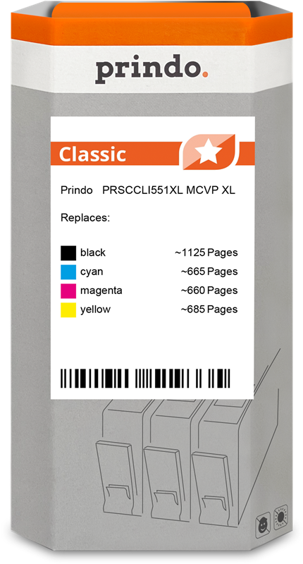 Prindo Classic XL multipack black / cyan / magenta / yellow (PRSCCLI551XL MCVP) (10)4.3/5.0 compatible with Canon CLI-551XL: 1x CLI-551bk XL + 1x CLI-551c XL + 1x CLI-551m XL + 1x CLI-551y XL ~1,125 pages kr315.96-63%kr116.10VAT incl., free shipping directly from stock Delivery time 1-2 days add to basket Content Prindo Classic XL black ~1.125 pages 2.6 p / page Prindo Classic XL cyan ~665 pages 4.4 p / page Prindo Classic XL magenta ~660 pages 4.4 p / page Prindo Classic XL yellow ~685 pages 4.2 p / page Graduated pricesfrom 1 pcs.kr116.10VAT incl.from 2 pcs.kr110.34VAT incl.from 4 pcs.kr104.53VAT incl.from 6 pcs.kr98.72VAT incl. Product information "Prindo Classic XL multipack black / cyan / magenta / yellow (PRSCCLI551XL MCVP)"multipack black / cyan / magenta / yellow ~1,125 pages compatible with Canon CLI-551XL: 1x CLI-551bk XL + 1x CLI-551c XL + 1x CLI-551m XL + 1x CLI-551y XL Prindo Promise: Top quality for a fair price, that is what our exclusive private label product line stand for Remanufactured original toners and cartridges, working parts changes and only highest quality of colors and materials Only selected partners and suppliers 5 years guarantee on Prindo products – no loss of warranty for your printer Read moreread lessSuitable for the following printersCanon PIXMA iPPIXMA iP7200PIXMA iP7250PIXMA iP8750Canon PIXMA iXPIXMA iX6850Canon PIXMA MGPIXMA MG5450PIXMA MG5550PIXMA MG5650PIXMA MG5655PIXMA MG6350PIXMA MG6450PIXMA MG6650PIXMA MG7100PIXMA MG7150PIXMA MG7550Canon PIXMA MXPIXMA MX725PIXMA MX925technical dataWeight & dimensionsWeight169 kgHeight90 mmDepth180 mmWidth45 mmFeaturesSizeXLYesNoBrand compatibilityPrindoTechnical detailsMaster (outer) case GTIN (EAN/UPC)All details without engagement. Data source: IceCatManufacturer information on product safety (GPSR)Media-Concept Bürobedarf GmbH Inselkammerstrasse 582008 Unterhaching E-mail: mail@prindo.no Website: www.prindo.no customer ratings3/24/2024, Noemi H. Translated from German:Exactly as described, and no worse than original inks, I am very satisfied.7/4/2020, Vitus Z. Translated from German:Good replacement for original6/18/2020, Linda K. Translated from German:Super Parons Print GoodShow more reviews. Suitable accessories for your printer Original Canon CLI-551BK black ink cartridge (6508B001)colourTape Width Size colour: Page number:~495 pagesPage price:29.2 p / pagekr144.49VAT incl., free shipping directly from stock add to basket directly from stock add to basket directly from stock add to basket directly from stock add to basket directly from stock add to basket directly from stock add to basket directly from stock add to basket directly from stock add to basket directly from stock add to basket directly from stock add to basket directly from stock add to basket directly from stock add to basket directly from stock add to basket directly from stock add to basket directly from stock add to basket Top seller compatible with Canon CLI-551BK XL black (6443B001) Prindo Green XL black ink cartridgecolourTape Width Size colour: Page number:~1,125 pagesPage price:12.0 p / pagekr135.41VAT incl., free shipping directly from stock add to basket directly from stock add to basket directly from stock add to basket directly from stock add to basket directly from stock add to basket directly from stock add to basket directly from stock add to basket Price / performance winner compatible with Canon CLI-551BK XL black (6443B001) Prindo Classic XL black ink cartridgecolourTape Width Size colour: Page number:~1,125 pagesPage price:7.0 p / pagekr78.99VAT incl., plus shipping costs directly from stock add to basket directly from stock add to basket directly from stock add to basket directly from stock add to basket directly from stock add to basket directly from stock add to basket directly from stock add to basket directly from stock add to basket Best price compatible with Canon CLI-551 Prindo Basic multipack black / cyan / magenta / yellowcolourTape Width Size colour: Page number:~1,290 pagesPage price:8.5 p / pagekr110.17VAT incl., free shipping directly from stock add to basket Original Canon multipack for your printer. Canon CLI-551BK black ink cartridge (6508B001)colourTape Width Size:Standard colour: Page number:~495 pagesPage price:29.2 p / pagekr144.49VAT incl., free shipping directly from stock add to basket Canon PGI-550pgbk black ink cartridge (6496B001)colourTape Width Size:Standard colour: Page number:~300 pagesPage price:58.7 p / pagekr176.13VAT incl., free shipping directly from stock add to basket Canon CLI-551BK XL black ink cartridge (6443B001)colourTape Width Size:XL colour: Page number:~1,125 pagesPage price:18.2 p / pagekr205.21VAT incl., free shipping directly from stock add to basket Canon PGI-550pgbk XL black ink cartridge (6431B001)colourTape Width Size:XL colour: Page number:~500 pagesPage price:41.0 p / pagekr205.10VAT incl., free shipping directly from stock add to basket Canon CLI-551 XL black / cyan / magenta / yellow value pack (+ 10x15 cm Fotopapier 50 Blatt)colourTape Width Size:XL colour: Page number:~2,800 pagesPage price:27.6 p / pagekr773.51VAT incl., free shipping directly from stock add to basket Canon CLI-551C cyan ink cartridge (6509B001)colourTape Width Size:Standard colour: Page number:~304 pagesPage price:47.8 p / pagekr145.19VAT incl., free shipping directly from stock add to basket Canon CLI-551C XL cyan ink cartridge (6444B001)colourTape Width Size:XL colour: Page number:~665 pagesPage price:29.6 p / pagekr196.72VAT incl., free shipping directly from stock add to basket Canon CLI-551GY Gray ink cartridge (6512B001)colourTape Width Size:Standard colour: Page number:~125 pagesPage price:115.1 p / pagekr143.91VAT incl., free shipping directly from stock add to basket Canon CLI-551GY XL Gray ink cartridge (6447B001)colourTape Width Size:XL colour: Page number:~275 pagesPage price:71.2 p / pagekr195.91VAT incl., free shipping directly from stock add to basket Canon CLI-551M magenta ink c