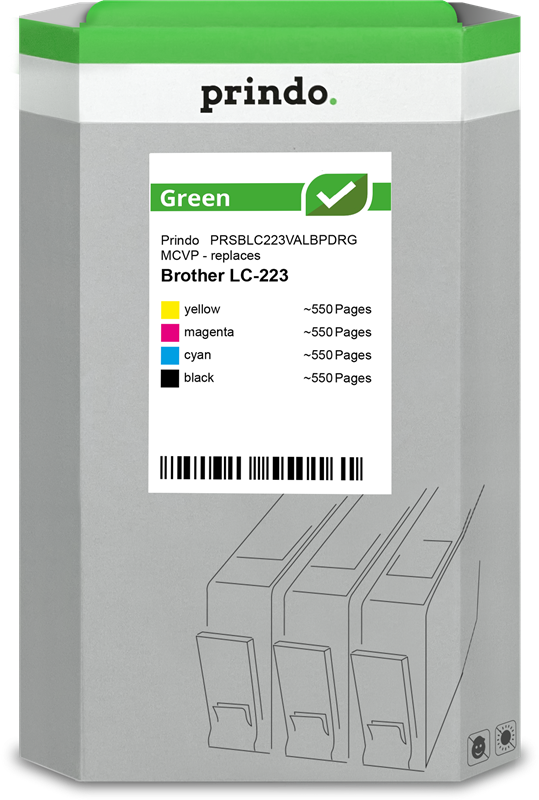 compatible with Brother LC-223 Prindo Green multipack black / cyan / magenta / yellow (PRSBLC223VALBPDRG MCVP) multipack black / cyan / magenta / yellow ~2,200 pages kr474.18VAT incl., free shipping directly from stock Delivery time 1-2 days add to basket Content Prindo Green black ~550 pages 28.9 p / page Prindo Green cyan ~550 pages 19.1 p / page Prindo Green magenta ~550 pages 19.4 p / page Prindo Green yellow ~550 pages 18.9 p / page Graduated pricesfrom 1 pcs.kr474.18VAT incl.from 2 pcs.kr450.52VAT incl.from 4 pcs.kr426.81VAT incl.from 6 pcs.kr403.10VAT incl. Product information "Prindo Green multipack black / cyan / magenta / yellow (PRSBLC223VALBPDRG MCVP)"multipack black / cyan / magenta / yellow ~2,200 pages Prindo Promise: Top quality for a fair price, that is what our exclusive private label product line stand for Remanufactured original toners and cartridges, working parts changes and only highest quality of colors and materials Only selected partners and suppliers 5 years guarantee on Prindo products – no loss of warranty for your printer Read moreread lessSuitable for the following printersBrother DCP-JDCP-J4120DWDCP-J562DWBrother MFC-JMFC-J4420DWMFC-J4620DWMFC-J4625DWMFC-J480DWMFC-J5320DWMFC-J5620DWMFC-J5625DWMFC-J5720DWMFC-J680DWMFC-J880DWtechnical dataWeight & dimensionsWeight179 kgHeight45 mmDepth180 mmWidth120 mmFeaturesSizeStandardYesYesBrand compatibilityPrindoTechnical detailsMaster (outer) case GTIN (EAN/UPC)All details without engagement. Data source: IceCatManufacturer information on product safety (GPSR)Media-Concept Bürobedarf GmbH Inselkammerstrasse 582008 Unterhaching E-mail: mail@prindo.no Website: www.prindo.no Suitable accessories for your printer Original Brother LC223BK black ink cartridgecolourTape Width Size colour: Page number:~550 pagesPage price:45.5 p / pagekr250.12VAT incl., free shipping directly from stock add to basket directly from stock add to basket directly from stock add to basket directly from stock add to basket directly from stock add to basket directly from stock add to basket directly from stock add to basket directly from stock add to basket directly from stock add to basket directly from stock add to basket Top seller compatible with Brother LC223BK black Prindo Green black ink cartridgecolourTape Width Size colour: Page number:~550 pagesPage price:29.1 p / pagekr159.84VAT incl., free shipping directly from stock add to basket directly from stock add to basket directly from stock add to basket directly from stock add to basket directly from stock add to basket directly from stock add to basket directly from stock add to basket directly from stock add to basket directly from stock add to basket Price / performance winner compatible with Brother LC223BK black Prindo Classic black ink cartridgecolourTape Width Size colour: Page number:~550 pagesPage price:27.0 p / pagekr148.56VAT incl., free shipping directly from stock add to basket directly from stock add to basket directly from stock add to basket Delivery date unknown add to basket directly from stock add to basket directly from stock add to basket directly from stock add to basket directly from stock add to basket directly from stock add to basket directly from stock add to basket Original Brother Ink cartridge for your printer. Brother LC223BK black ink cartridgecolourTape Width Size:Standard colour: Page number:~550 pagesPage price:45.5 p / pagekr250.12VAT incl., free shipping directly from stock add to basket Brother LC227XLBK black ink cartridgecolourTape Width Size:XL colour: Page number:~1,200 pagesPage price:29.4 p / pagekr353.31VAT incl., free shipping directly from stock add to basket Brother LC-227XL+LC-225XL black / cyan / magenta / yellow value pack (LC227XLVALBPDR)colourTape Width Size:XL colour: Page number:~4,800 pagesPage price:20.5 p / pagekr982.57VAT incl., free shipping directly from stock add to basket Brother LC223C cyan ink cartridgecolourTape Width Size:Standard colour: Page number:~550 pagesPage price:29.6 p / pagekr162.87VAT incl., free shipping directly from stock add to basket Brother LC225XLC cyan ink cartridgecolourTape Width Size:XL colour: Page number:~1,200 pagesPage price:18.4 p / pagekr220.22VAT incl., free shipping directly from stock add to basket Brother LC223M magenta ink cartridgecolourTape Width Size:Standard colour: Page number:~550 pagesPage price:29.6 p / pagekr162.87VAT incl., free shipping directly from stock add to basket Brother LC225XLM magenta ink cartridgecolourTape Width Size:XL colour: Page number:~1,200 pagesPage price:18.6 p / pagekr222.67VAT incl., free shipping directly from stock add to basket Brother LC223Y yellow ink cartridgecolourTape Width Size:Standard colour: Page number:~550 pagesPage price:30.0 p / pagekr164.96VAT incl., free shipping directly from stock add to basket Brother LC225XLY yellow ink cartridgecolourTape Width Size:XL colour: Page number:~1,200 pagesPage price:18.1 p / pagekr217.43VAT incl., free shipping directly from stock add to basket Brother LC-223 multipack black / cyan / magenta / yellow (LC223VALBPDR)colourTape Width Size:Standard colour: Page number:~2,200 pagesPage price:34.8 p / pagekr766.18VAT incl., free shipping directly from stock add to basket Our Top Sellers Compatible Prindo Green Ink cartridge for your printer.✅ Level indicator ✅ Environmentally friendly recycled ✅ More printing performance ✅ 5-year warranty ✅ No loss of warranty for your printer compatible with Brother LC223BK black Prindo Green black ink cartridgecolourTape Width Size:Standard colour: Page number:~550 pagesPage price:29.1 p / pagekr159.84VAT incl., free shipping directly from stock add to basket compatible with Brother LC227XLBK black Prindo Green XL black ink cartridgecolourTape Width Size:XL colour: Page number:~1,200 pagesPage price:19.0 p / pagekr228.48VAT incl., free shipping directly from stock add to basket compatible with Brother LC-227XL+LC-225XL Prindo Green XL black / cyan / magenta / yellow va